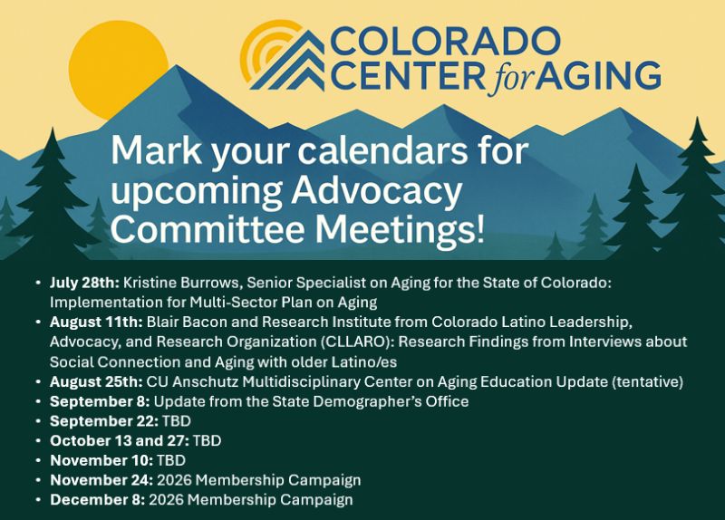 The Colorado Center for Aging’s Advocacy Committee Meetings (ACM) offer a consistent forum for advocates, professionals, and community members to engage in timely discussions on aging-related policy and systems change.