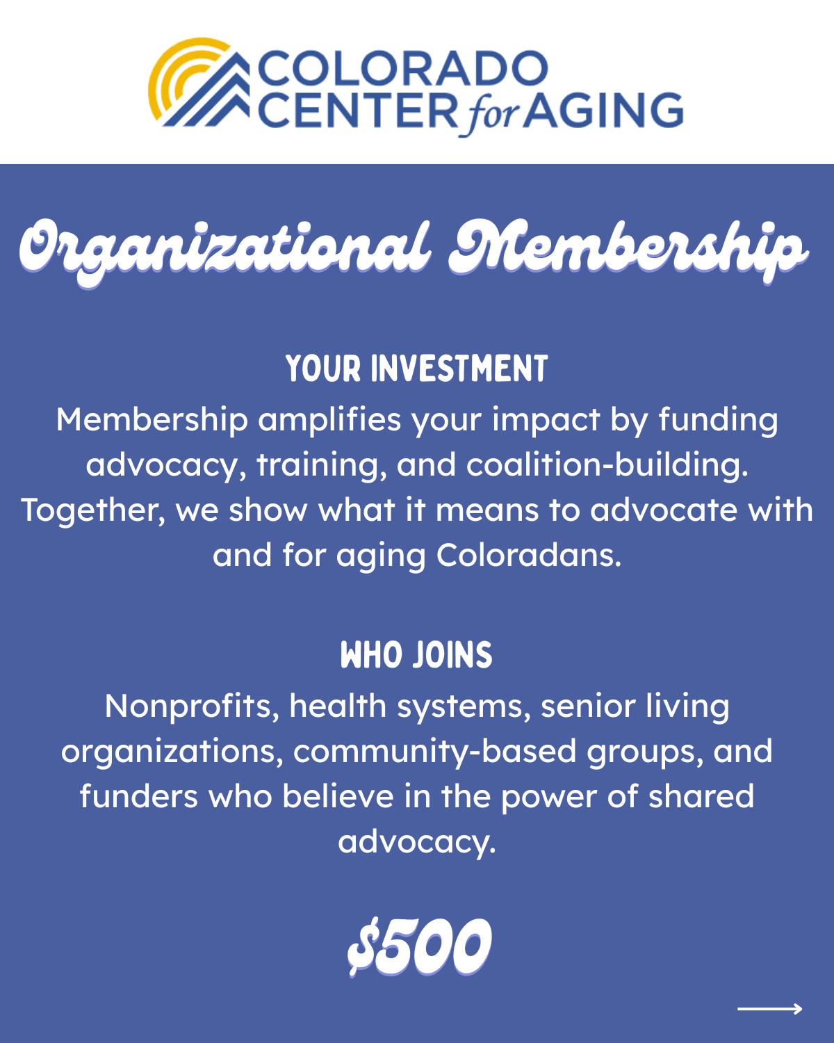 Colorado Center for Aging will be sending out membership renewal requests for calendar year 2026 via email. Please consider joining us with your financial support so together we can continue our great work together, advocating for older adults across Colorado.
